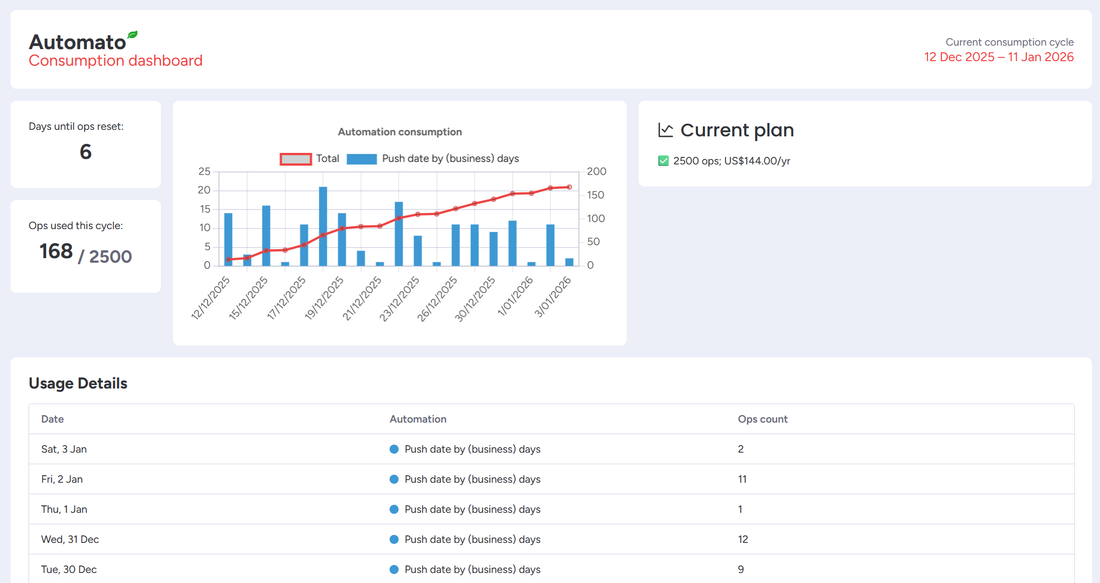 The consumption cycle is the period in which automation op usage is collected. If your account is on a paid plan, this period runs for a month from the day of the month the subscription started. If you’re on a free or trial plan, this period runs for a month from the day of the month you first installed the app.